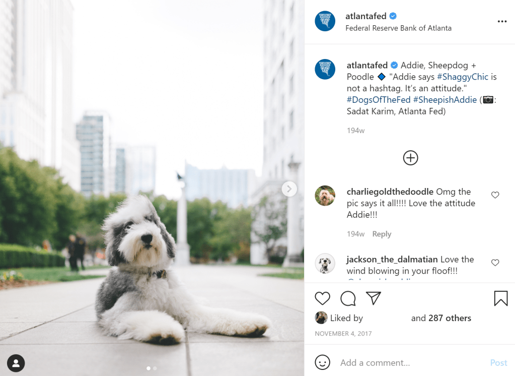 I first realized we were on to something when my co-worker and I got invites to other community events around Atlanta. Typically, we’d send someone higher than us, but people were asking for the “dog people.” Then, the phone calls started. Other Reserve Banks wanted to know if they could use the hashtag (of course!), and I think the mind-blown moment was when a colleague at the European Central Bank reached out. They were impressed by the account, especially the dogs, and wanted to know if we’d be willing to share our strategy. Here’s the thing: some people hold that stuff close to the vest. Not me. I know what works for us may not work for someone else, but if I can help another organization up its game, I’m happy to do that.