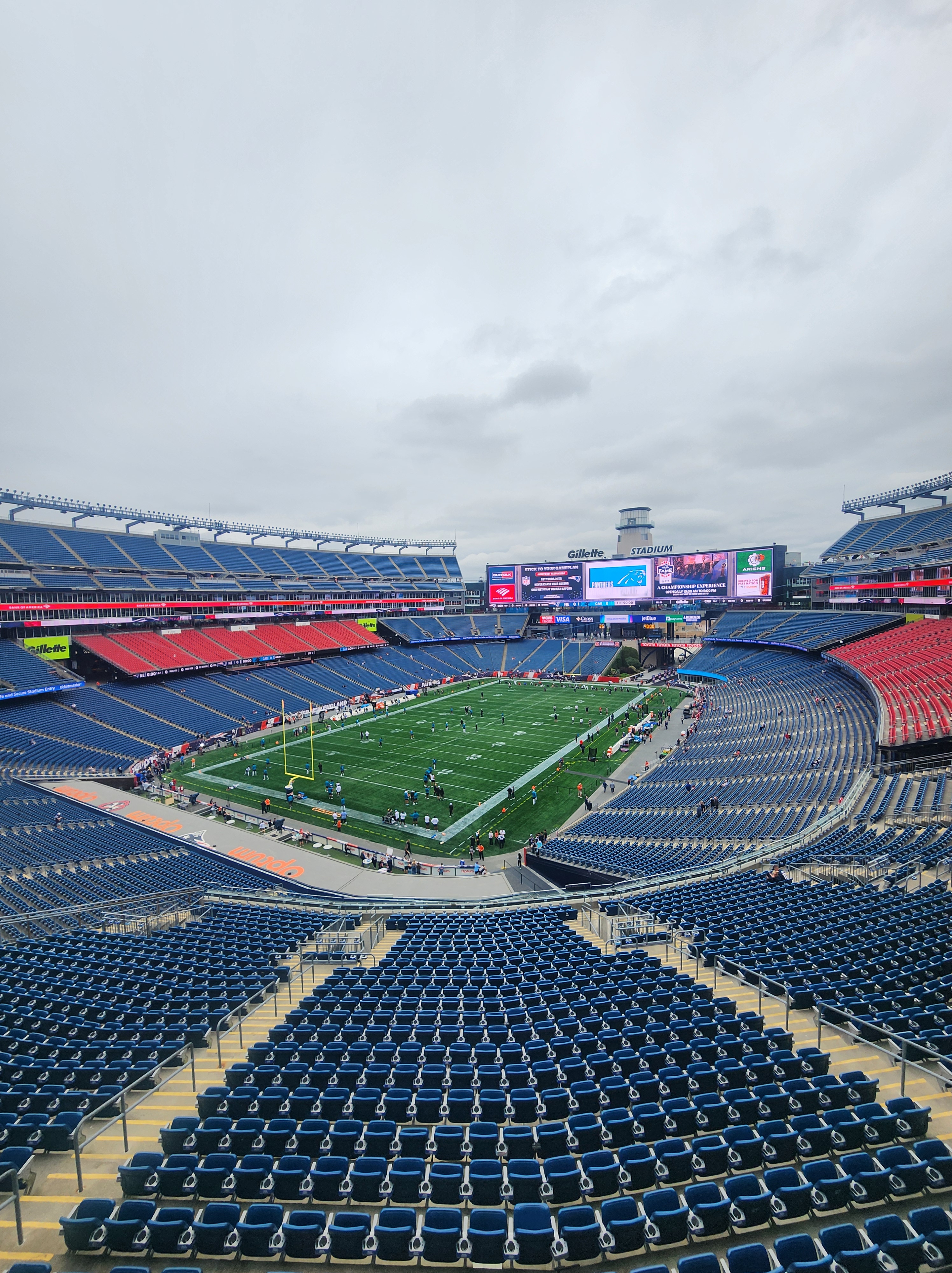 After all, moving to Boston was a jump off the ledge, so why not take one more leap of faith? When Josh Manck reached out to ask if I’d be interested in working with the NFL, I said yes. Always the Nervous Nancy with something new; I’ve spent this past offseason learning the NFL stats entry system and entering the New England Patriots first preseason game of the 2024 season, my anxiety was in overdrive. My first view of Gillette Stadium from the main press box level gave me pause. I snapped the pic below to have this memory of this moment.